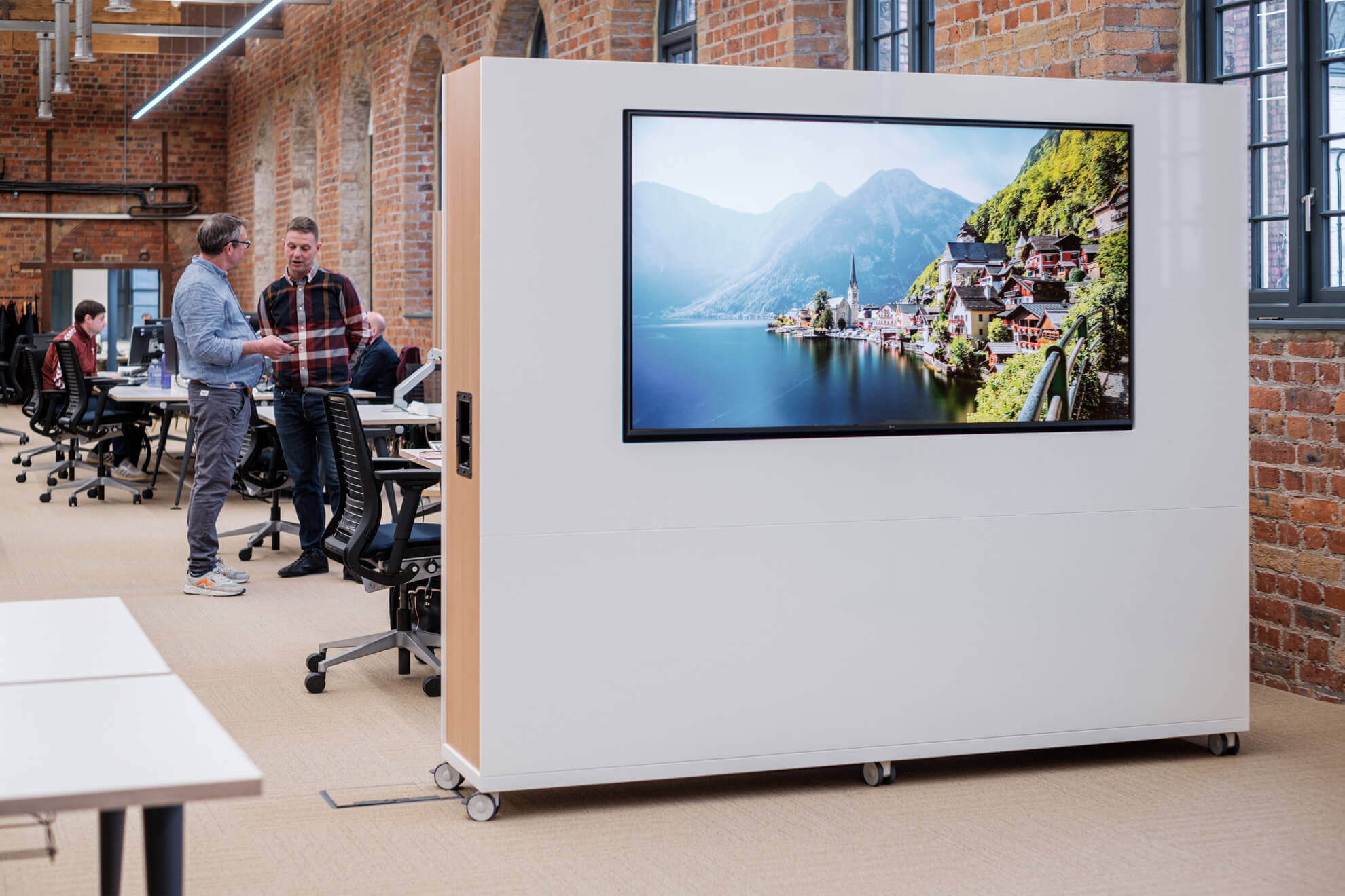 The ThinkingWall® Divider range – sleek, stable mobile dividing walls featuring web connected AV technology, drywipe surface and storage.
