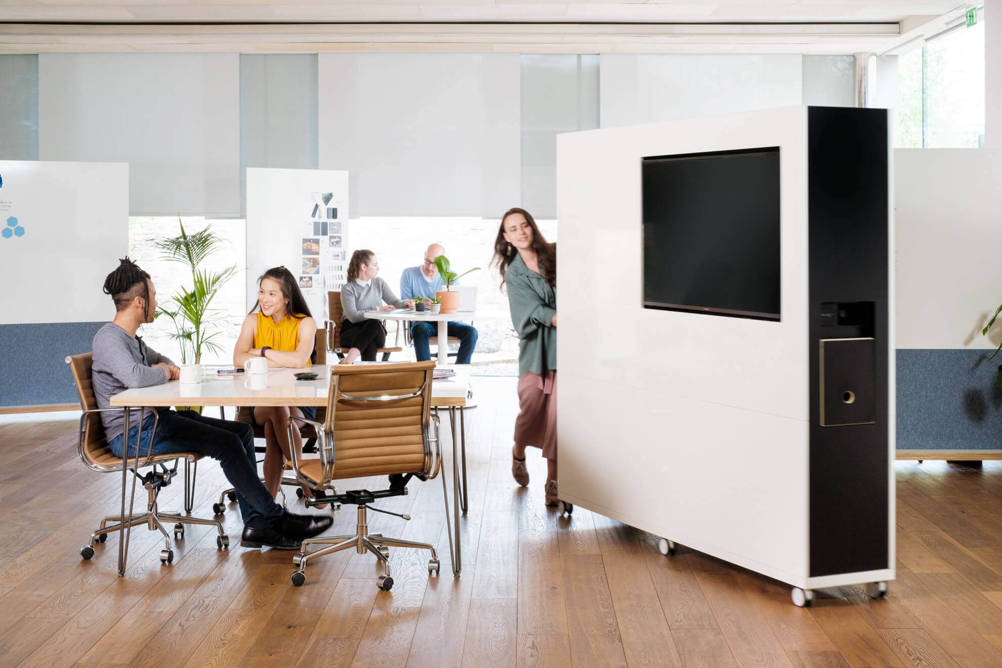 These movable walls provide functionality for supporting creativity and collaboration – whiteboards for collaborative thinking and planning, AV for remote connectivity plus in built storage.