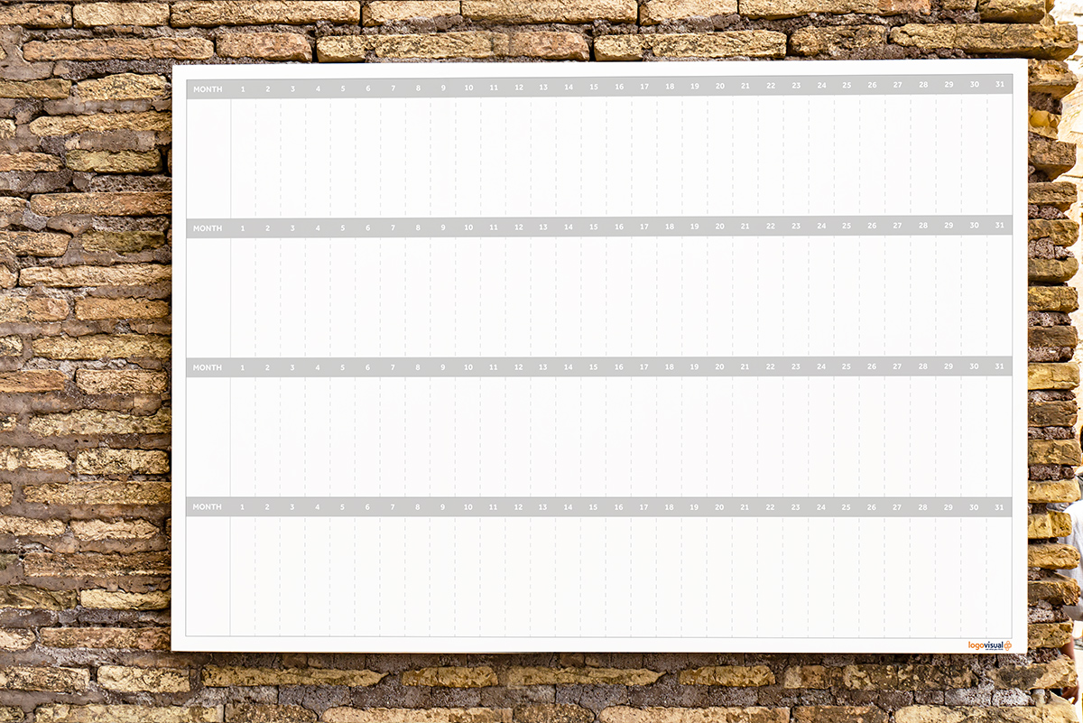 Features a 4 month view with blank boxes for each day of the month. The month title can be written into the box at the start of each month allowing for a rolling monthly plan. The oldest month can be easily wiped off allowing for the next month to be added.