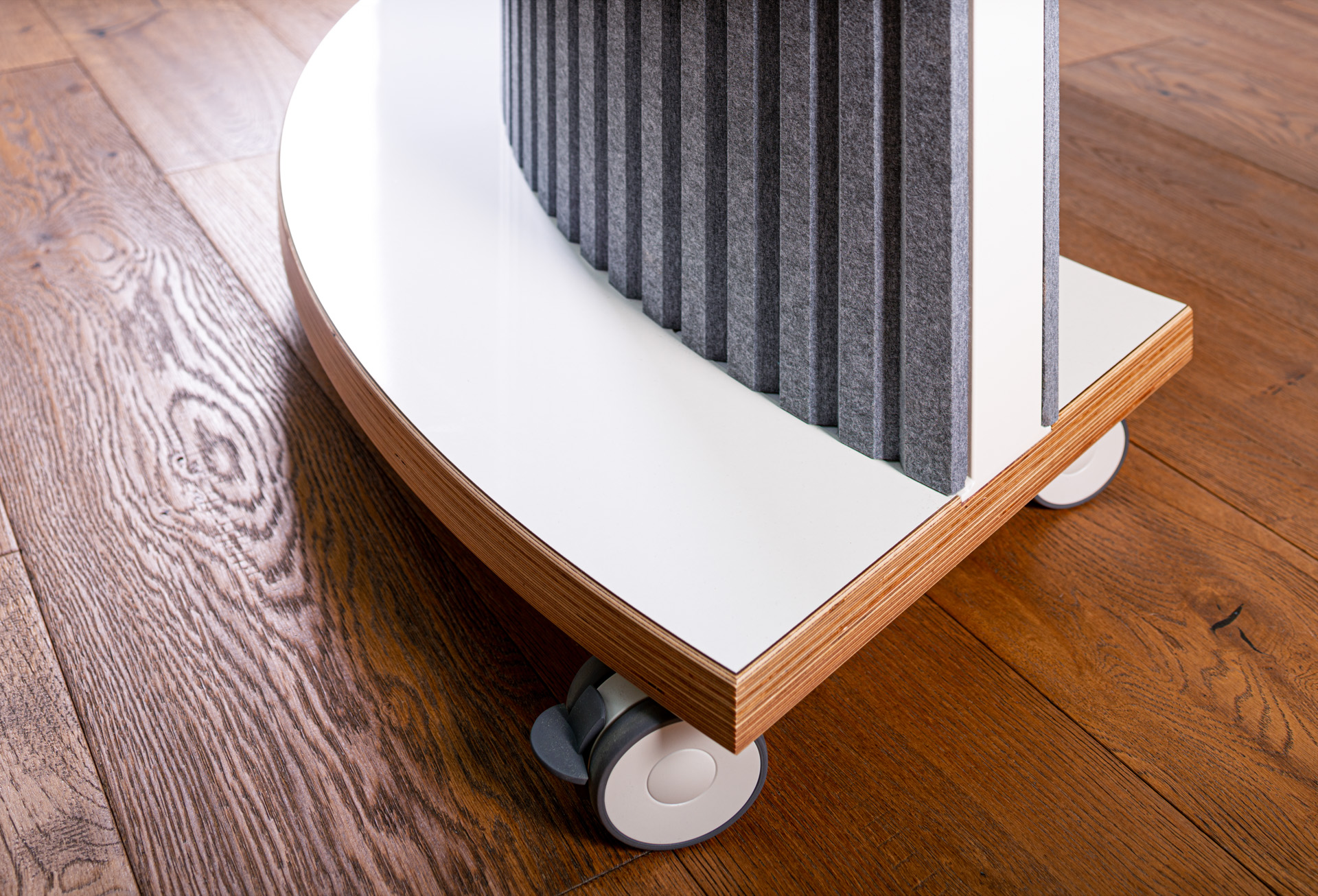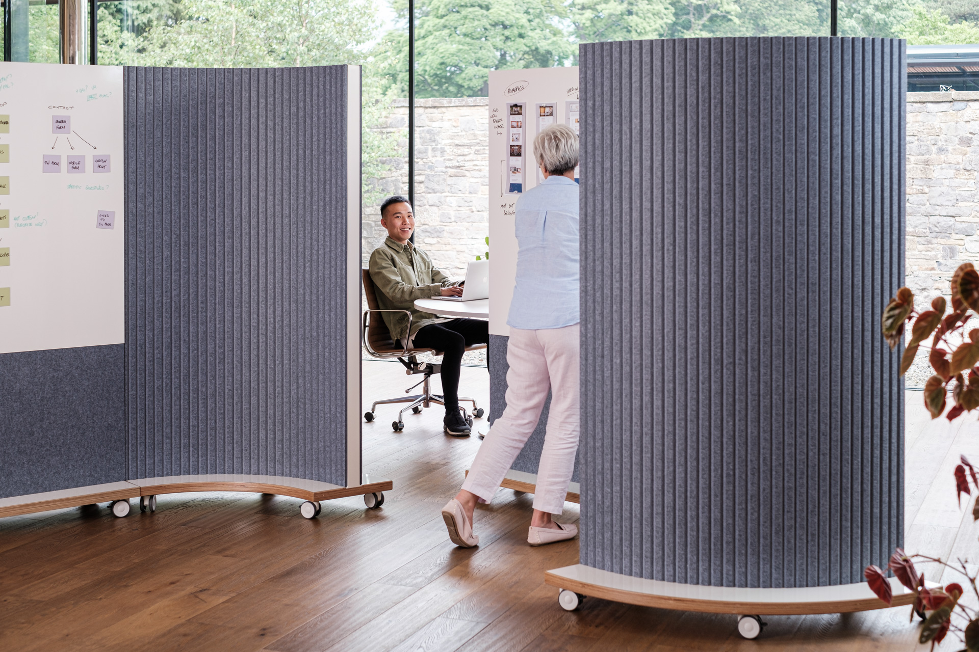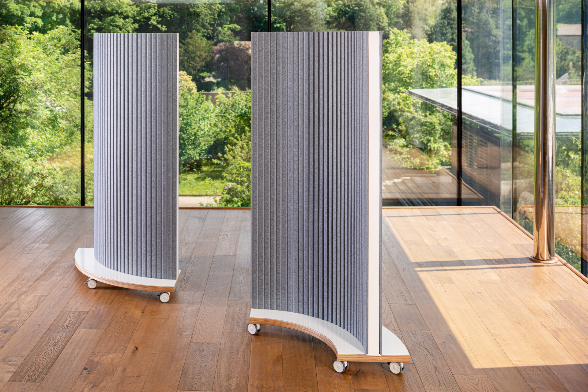 A curved freestanding mobile acoustic partition screen with lockable castors and ridged surface design which can be pushed together in a variety of different orientations to suit the space.