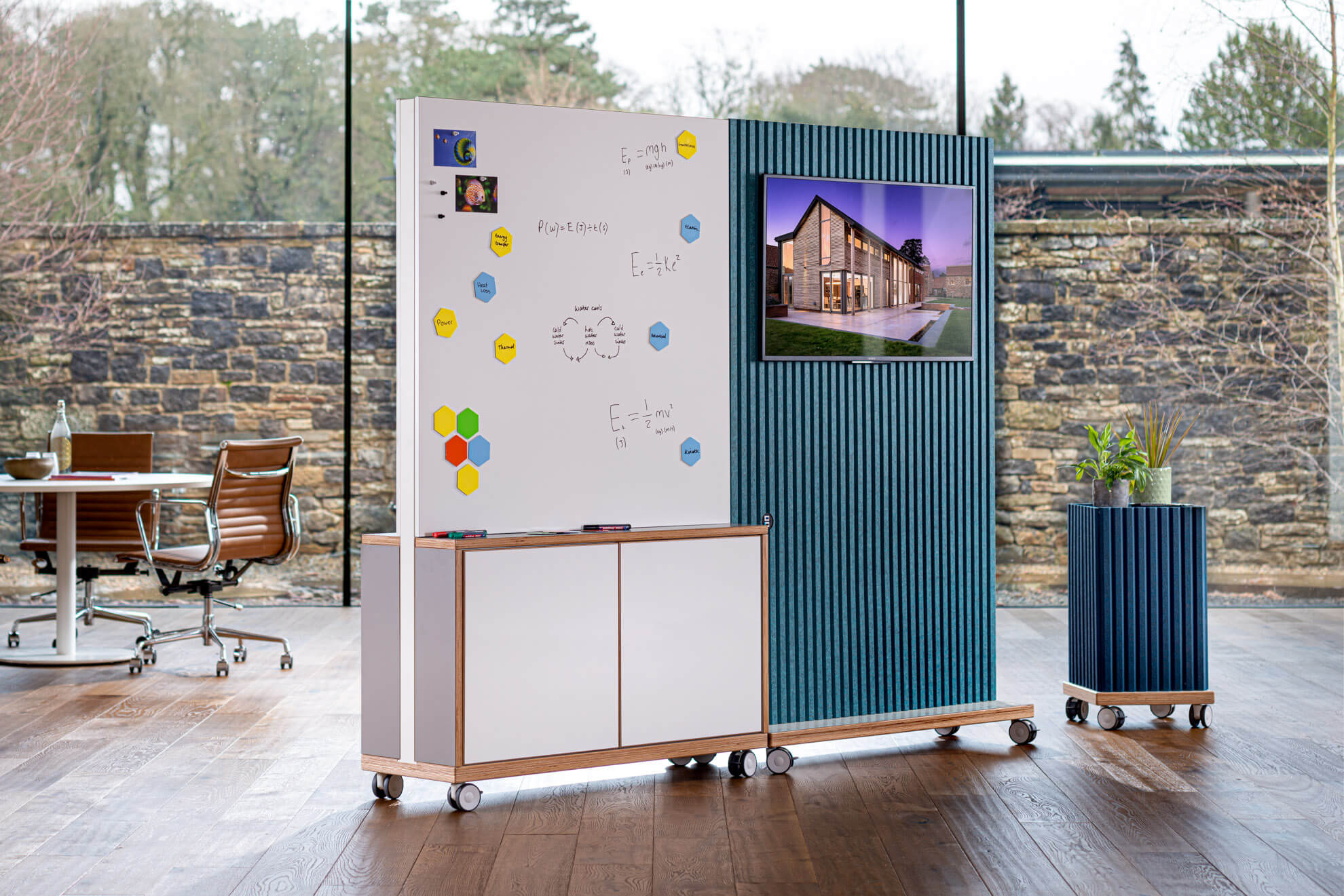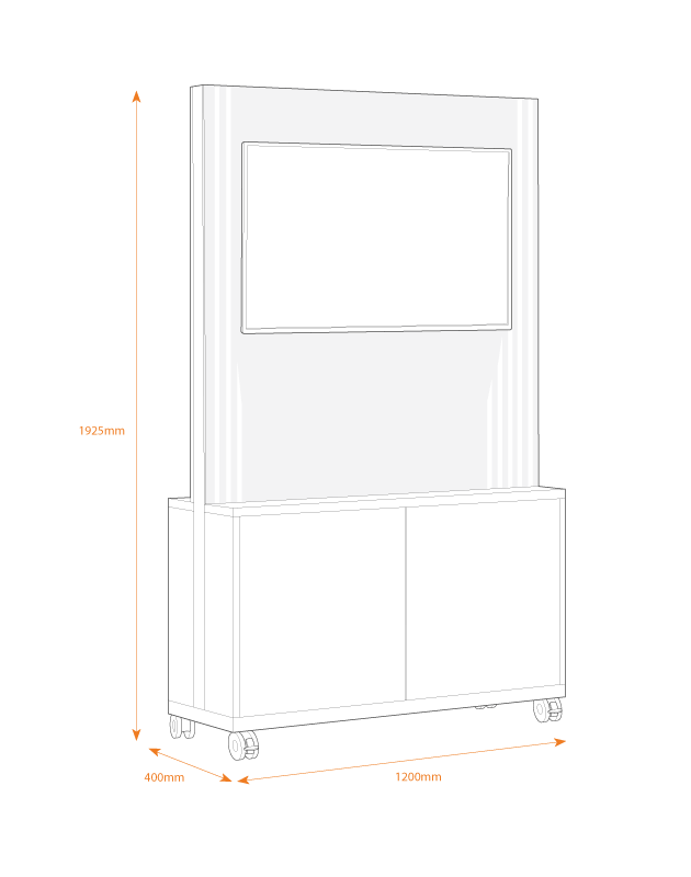 A mobile and freestanding storage unit designed with customisable options to integrate shelving, whiteboards, screens and AV equipment.