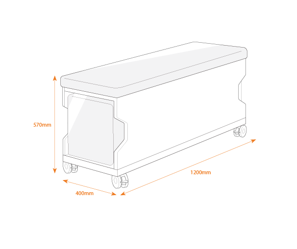 The sturdy base includes four lockable castors and a padded seat top. The separate individual stools are stored inside the bench so they can be easily taken out when more seating space is required.